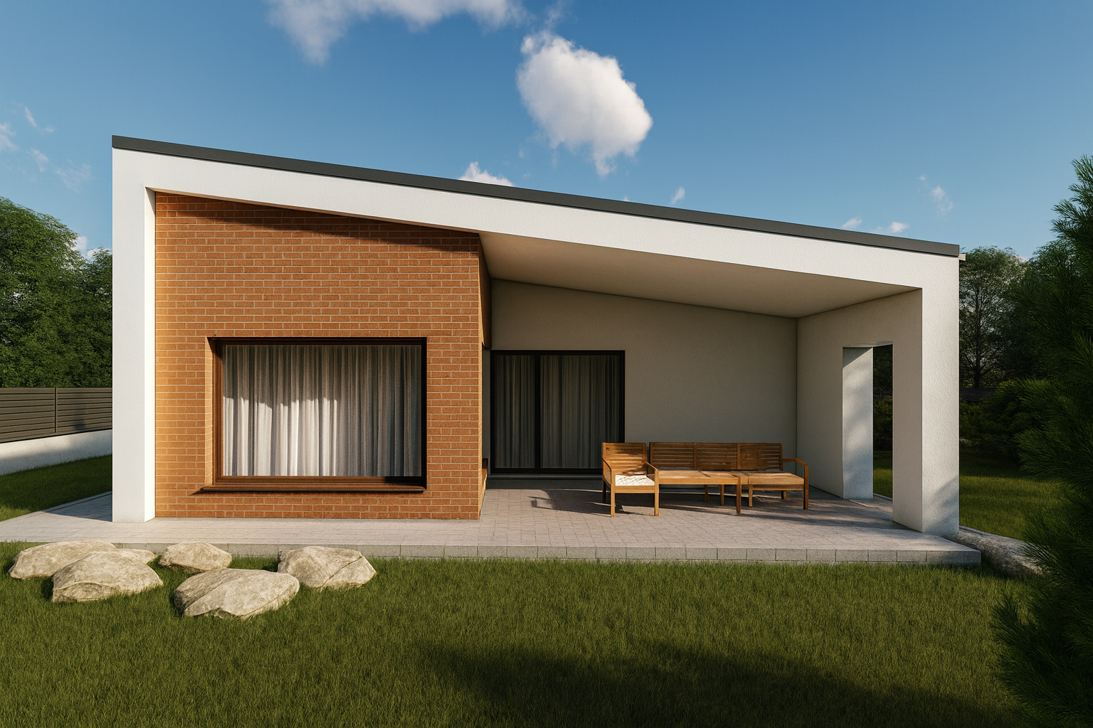 Veľké presklené plochy zabezpečujú dostatok denného svetla a plynulé prepojenie s krytou terasou, ktorá sa v letných mesiacoch stáva prirodzeným pokračovaním obývacej časti domu.